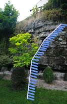 I am proposing a temporary structure, which will give a scaled impression of the 186 steps at Mauthausen, within the gardens at Bambington House. This structure will have 186 “steps”, leading a curving walkway of blue light from the base of the “quarry” up to the face of the cliff in the garden.